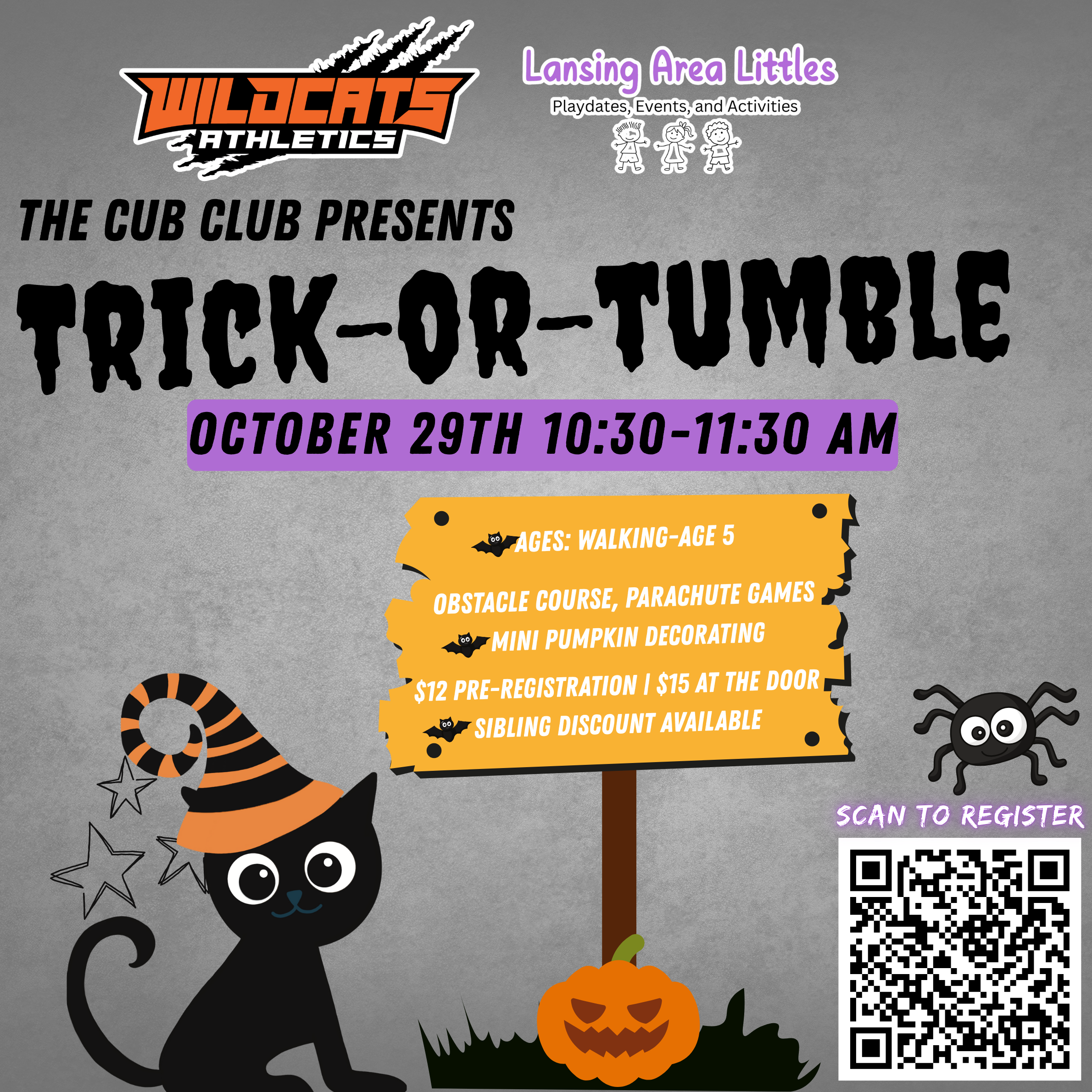 It’s time for some Halloween fun—WILDCATS style! Our Cub Club Trick or Tumble event is the perfect way for little ones to celebrate the season with movement, music, and a little spooky sparkle.